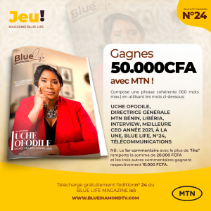 Les nouveaux gagnants du jeu concours portant sur le magazine 24 sont connus! Il s’agissait donc de Composer une phrase cohérente (100 mots max) en utilisant les mots : (UCHE OFODILE, DIRECTRICE GÉNÉRALE MTN BÉNIN, LIBÉRIA, INTERVIEW, MEILLEURE CEO ANNÉE 2021, À LA UNE, BLUE LIFE, N°24, TÉLÉCOMMUNICATIONS). Le 1er commentaire avec le plus de « like » remporte la somme de 20.000 FCFA et les trois autres commentaires gagnent respectivement 10.000 FCFA