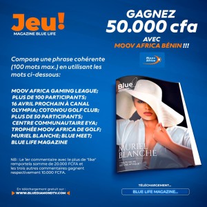 Les nouveaux gagnants du jeu concours portant sur le magazine 25 sont connus! Il s’agissait donc de Composer une phrase cohérente (100 mots max) en utilisant les mots : (MOOV AFRICA GAMING LEAGUE; PLUS DE 100 PARTICIPANTS; 16 AVRIL PROCHAIN À CANAL OLYMPIA; COTONOU GOLF CLUB; PLUS DE 50 PARTICIPANTS; CENTRE COMMUNAUTAIRE EYA; TROPHÉE MOOV AFRICA DE GOLF; MURIEL BLANCHE; BLUE MEET; BLUE LIFE MAGAZINE). Le 1er commentaire avec le plus de « like » remporte la somme de 20.000 FCFA et les trois autres commentaires gagnent respectivement 10.000 FCFA