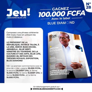Les nouveaux gagnants du jeu concours portant sur le magazine 28 sont connus ! Il s’agissait donc de Composer une phrase cohérente (100 mots max) en utilisant les mots : ( LE PRÉSIDENT DE LA RÉPUBLIQUE, PATRICE TALON, À LA UNE, BABALOLA JEAN-MICHEL HERVÉ ABIMBOLA, BLUE MEET, MINISTRE DU TOURISME, DE LA CULTURE ET DES ARTS, BLUE LIFE, NUMERO 28, RETOUR DES TRÉSORS ROYAUX, EXPOSITION, BLUE DIAMOND).