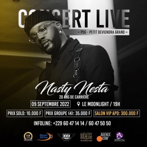 20 ans, ça se célèbre et de la plus belle des façons : En musique ! NASTY NESTA, pour marquer cet anniversaire, fera un concert live le 09 Septembre 2022, jour de son anniversaire. Il se déroulera au MOON LIGHT à Fidjrossè à partir de 19h ! 20 ans ça se fête, ça se célèbre ! Ensemble avec NASTY NESTA pour célébrer ces 20 ans en musique passée, actuelle et à venir !