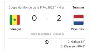 Pour ce premier choc de la coupe du monde, le Sénégal affrontait les Pays-Bas (Groupe A). Dans un rythme parfait où les deux équipes tentaient de se neutraliser, il aura fallu attendre les dernières minutes pour que les filets tremblent. Les néerlandais s’en sortent vainqueurs 2-0 face aux hommes d’Aliou Cissé grâce à des buts de Cody Gakpo (84e minute) puis de Davy Klaassen (98e minute). Les néerlandais prennent donc la tête du groupe A en compagnies des équatoriens vainqueurs du Qatar le dimanche dernier sur le même score (2-0).
