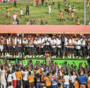 La liesse était indescriptible à travers toutes les rues ivoiriennes et même au-delà de ces terres, dans l’après-midi (15h) du lundi 12 février 2024. Pour partager l’immense joie d’être champion d’Afrique avec leur communauté, les Éléphants de la Côte d’Ivoire ont pour l’occasion présenté le trophée aux nombreux supporters ivoiriens avec à leur tête le Président de la République (Alassane Ouattara). La parade fut organisée dans plusieurs quartiers connus du 225 (la maison Palmier, le Boulevard Latrille, Pont ADO, le Boulevard Lagunaire Plateau, Treichville, l’Avenue Nanan Yamousso, la Gare de Bassam, le CHU de Treichville, le Boulevard de Marseille, le Carrefour Ancien Koumassi, le VGE Grand Carrefour de Koumassi, le VGE, Orca, le VGE Palais des Sports, la Place de la République, Plateau, le Stade Félix Houphouët Boigny). Plusieurs artistes nationaux (comme Alpha Blondy) n’ont pas manqué de ponctuer cet événement par leur présence. Cerise sur le gâteau ? Au-delà du concert gratuit organisé au sein du grand stade Félix Houphouët Boigny, TamSir et la Team Paiya ont simplement mis le feu avec l’hymne officieuse de la CAN : “Coup de Marteau”. Par ailleurs, les éléphants et leurs encadreurs ont été reçus au Palais de la Présidence.